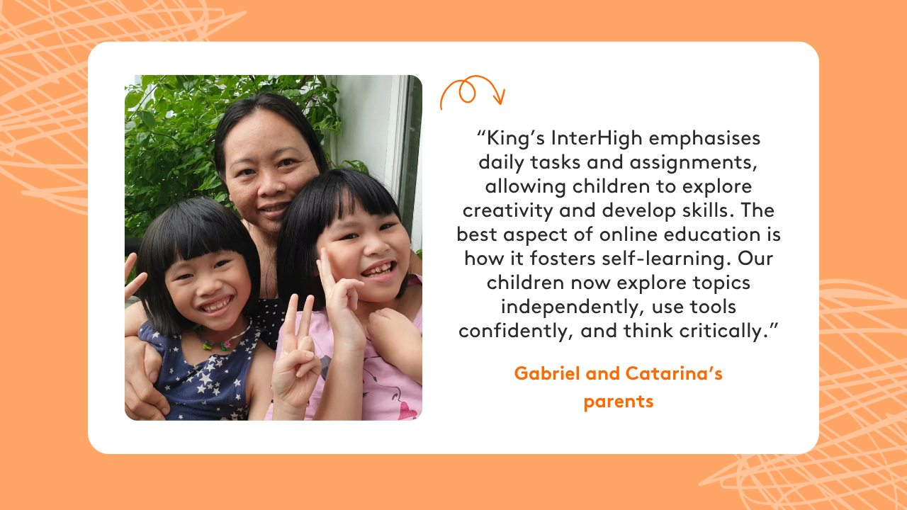 With the guidance of their teachers, online school students are also equipped to become independent, driven learners. Gabriel and Catarina’s parents say, “The best aspect of online education is how it fosters self-learning. Our children now explore topics independently, use tools confidently, and think critically.Mrs. Kanagasabai saw the same transformation in her sons, stating, “Since joining King’s InterHigh, my children have become independent learners. They can research by themselves and present what they’ve learned directly to their teachers.