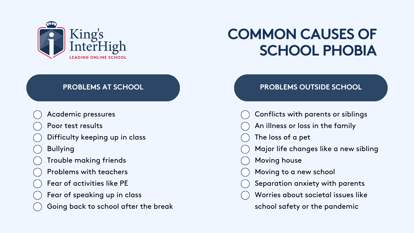 School phobia is often caused by problems at school, such as bullying or poor grades, but it can also be triggered by problems at home, like the loss of a family member or a recent move.